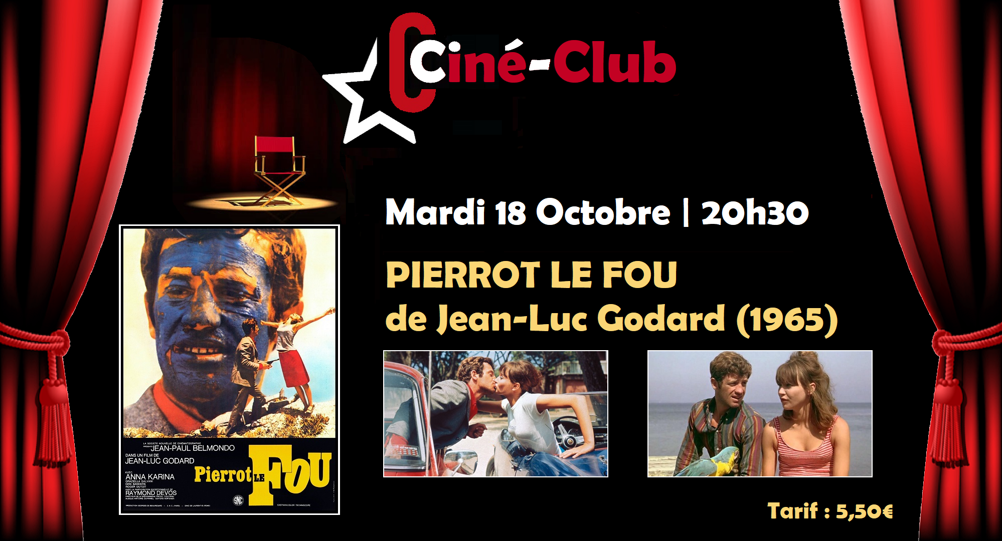 MARDI 18 OCTOBRE 2022 | 20h30 | CINÉ-CLUB V #2 : PIERROT LE FOU de Jean-Luc GODARD