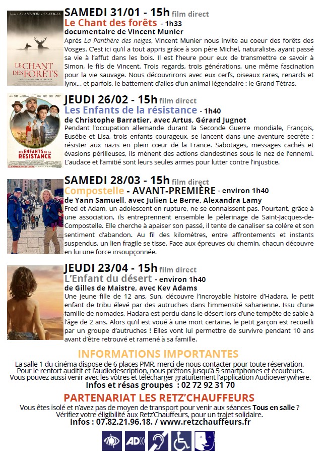 Dates des prochaines séances TOUS EN SALLE, toujours à 15h :