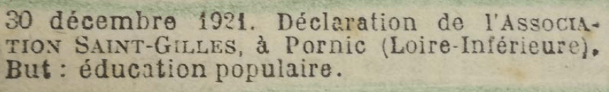 Si dès 1918, nous trouvons une activité théâtrale à la salle Saint Gilles, c’est le 26 décembre 1921 que naît officiellement l’Association Saint Gilles : association d’éducation populaire proposant projections cinématographiques, musique, sports, conférences. Le siège est au 54, rue de Paimboeuf, devenue depuis rue de Verdun.